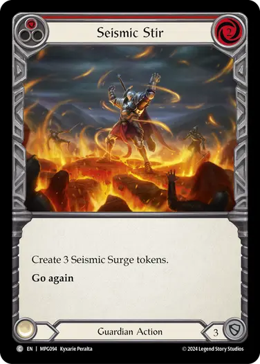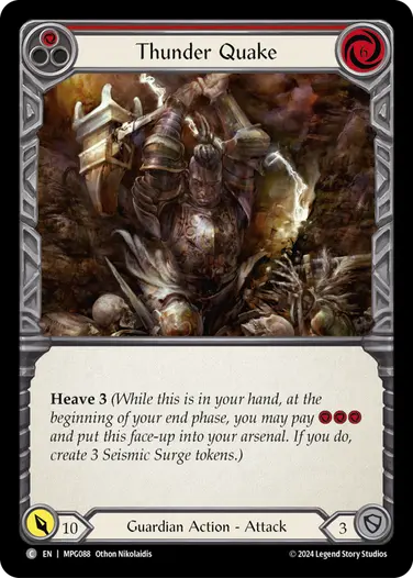 Of course, these crush cards only get dominate when there are Seismic Surge tokens in play. And how do we do that? The next big mechanic in Mastery Pack Guardian is Heave. Heave is an ability that some cards have that will trigger at the beginning of your end phase, and the ability is accompanied by a number. For this example, let’s look at Thunder Quake with the text Heave 3. Heave 3 says “While this is in your hand, at the beginning of your end phase, you may pay 3 resources and put this face-up into your arsenal. If you do, create 3 Seismic Surge tokens”. This is the perfect way to get 3 seismic surge tokens, and while Thunder Quake itself does not have Crush, you can choose to play another attack from hand with Crush, or find a way to put Thunder Quake back into your deck with another effect.