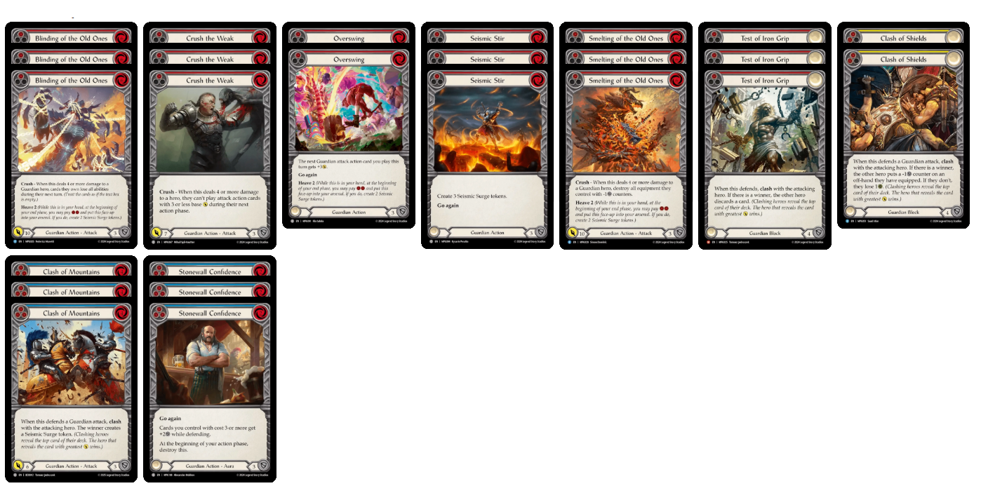 The deck offers a great set of blues that block well, yet also generate value in terms of creating Seismic Surge tokens or disrupting the more aggressive classes. Solid Ground is a great example of a defence reaction that can block for 5 and often for free, while also being a blue card to pitch if needed. Thunder Quake and Macho Grande offer great punching power in their blue versions while also blocking very efficiently. Against other Guardians, Seismic Shelter and even Stonewall Confidence in the inventory help deal with powerful dominated attacks.